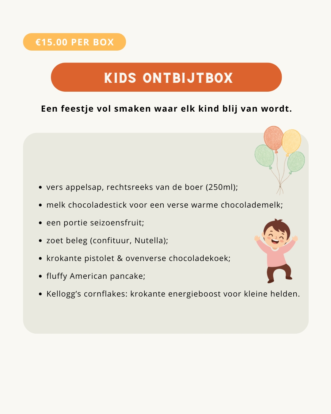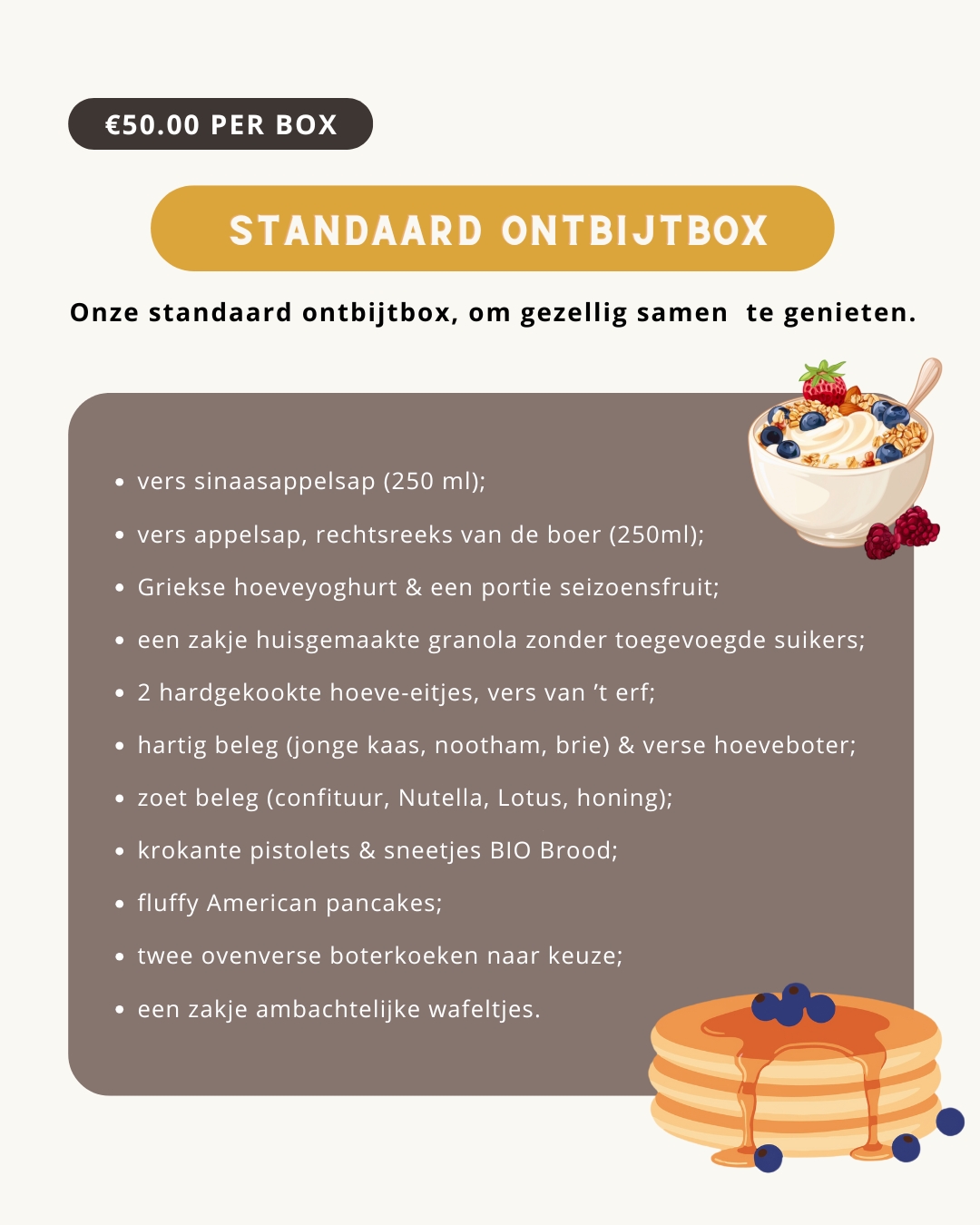 Voor ontbijtboxen die binnen 24 uur plaatsvinden, vragen wij u vriendelijk telefonisch contact op te nemen.