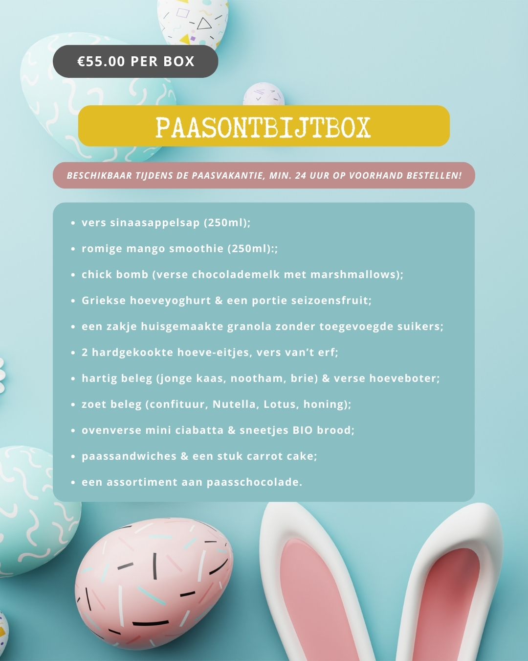 Voor ontbijtboxen die binnen 24 uur plaatsvinden, vragen wij u vriendelijk telefonisch contact op te nemen.